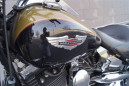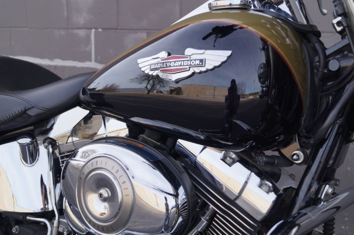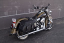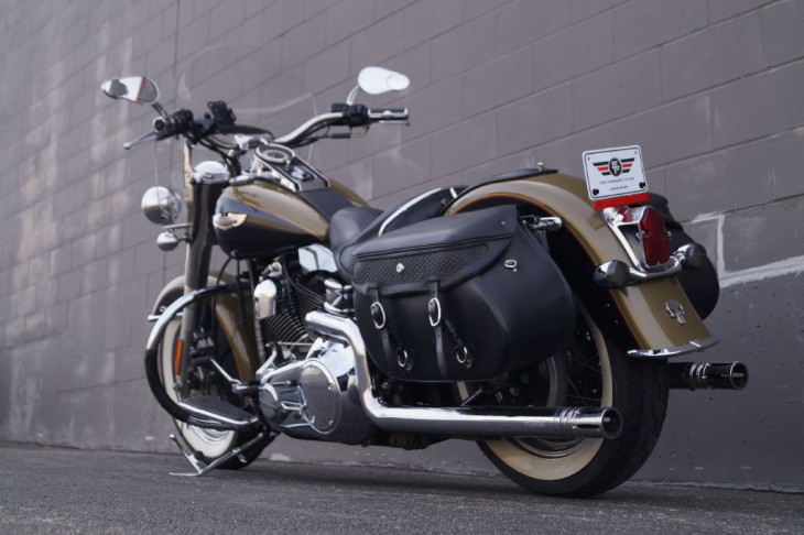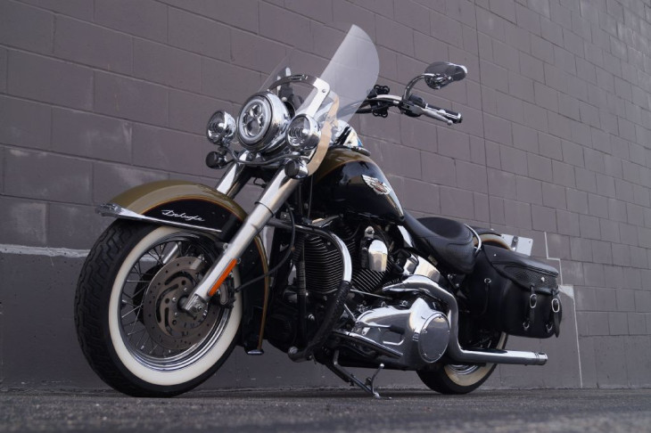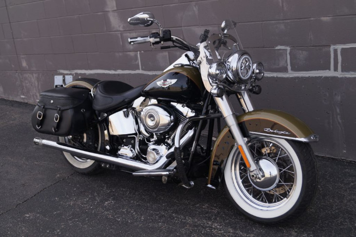 One of Harley's most nostalgic models, the Softail Deluxe, is equipped with wide white wall tires and chrome laced rims, a tombstone tail light, chrome trimmed floorboards and seat, a retro speedometer gauge, and long chrome tipped fenders. This bike is finished in olive green and vivid black two-tone paint and the previous owner has added a set of true dual exhaust with heat wrap hidden under the heat shields, a performance air cleaner, a quick detach windshield, leather wrapped highway bar, heated grips, and a pair of real leather saddlebags. A new rear tire was just installed and all fluids and maintenance are up to date.