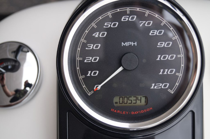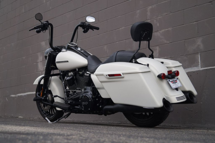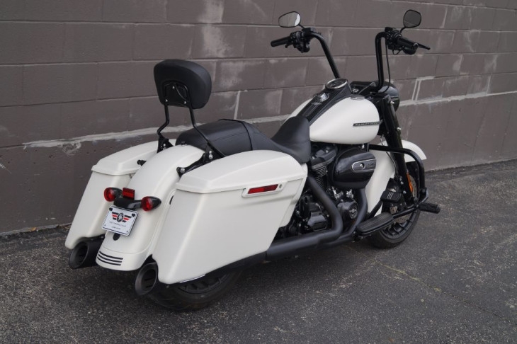 This gorgeous Road King Special looks great with black accents against the denim white paint. Comes with black highway bar and pegs, black 14in handlebars, black Harley grips, black Screamin Eagle mufflers, black quick release backrest, factory extended bags, streamliner floorboards, three bar rear fender marker light and integrated tail lights with the rear signals, and the 114ci Milwaukee 8 engine. Priced $2,600 under book!