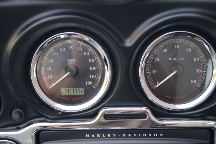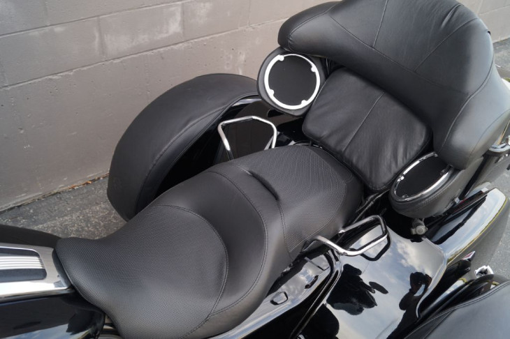 This low mileage trike is outfitted with chrome front forks, a set of highway pegs, kuryakyn iso grips with a throttle boss, HD mud flaps, a chrome rear bumper, upgraded seat, passenger grab handles, leather rear fender bras, windshield pouch organizer, chrome tail light trim, shorty antennas, and the big 3 performance upgrades that include a set of slash cut pipes, stage 1 air filter, and Screamin Eagle fuel tuner.