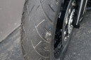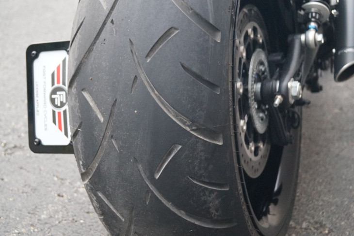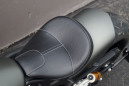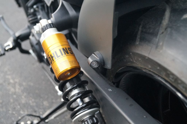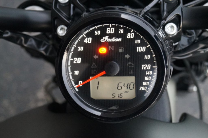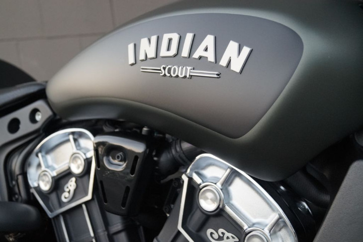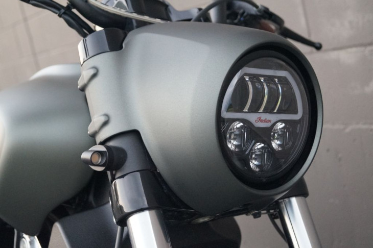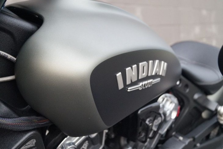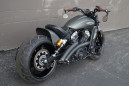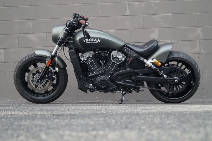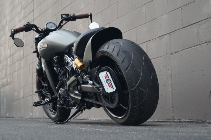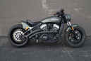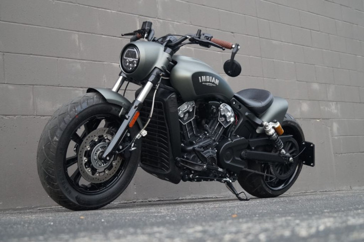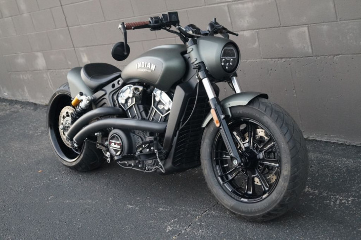 Highly customized Indian Scout Bobber ABS with a 240 rear tire kit from RC Components that includes a wide swingarm and custom front and rear rims, then this one also added Ohlins rear shocks, a completely custom rear fender, custom blacked out headlight bezel with an adaptive headlight unit inside, Accutronix side mounted license plate bracket, Micron LED turn signals by Combustion Industries, brown Cult grips from VANS with bar end mounted mirrors, Joker Machine Long Serrated black footpegs, a custom seat, and a stage one performance upgrade with air cleaner, Freedom performance exhaust, and a tune.