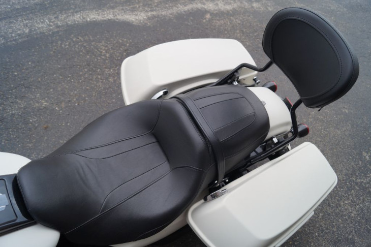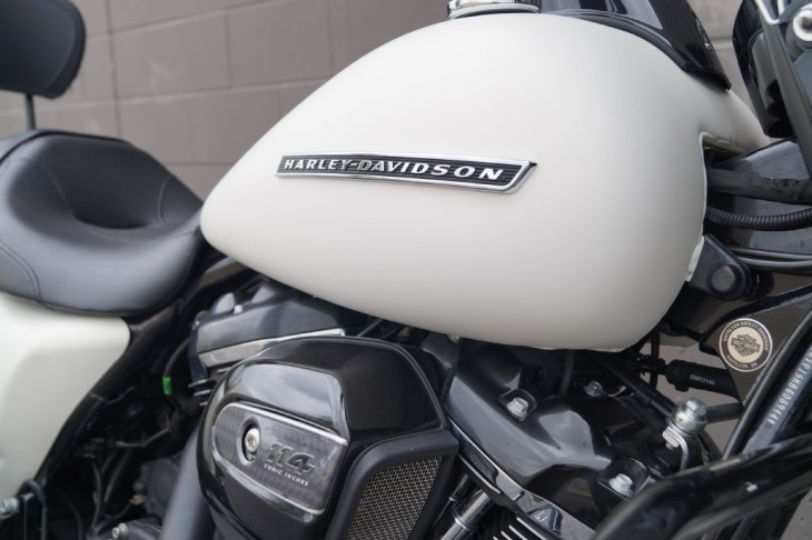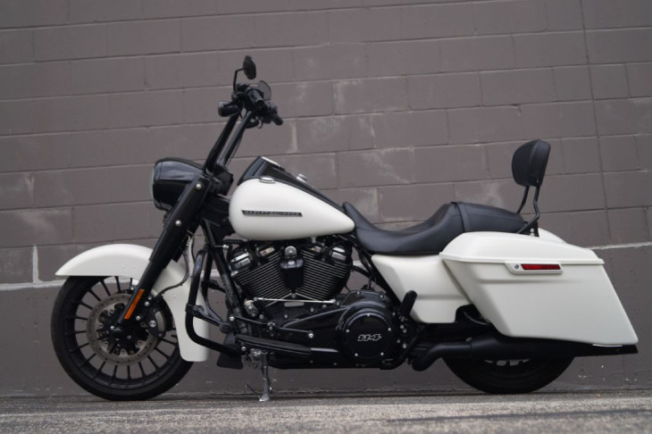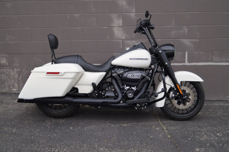 This gorgeous Road King Special looks great with black accents against the denim white paint. Comes with black highway bar and pegs, black 14in handlebars, black Harley grips, black Screamin Eagle mufflers, black quick release backrest, factory extended bags, streamliner floorboards, three bar rear fender marker light and integrated tail lights with the rear signals, and the 114ci Milwaukee 8 engine. Priced $2,600 under book!