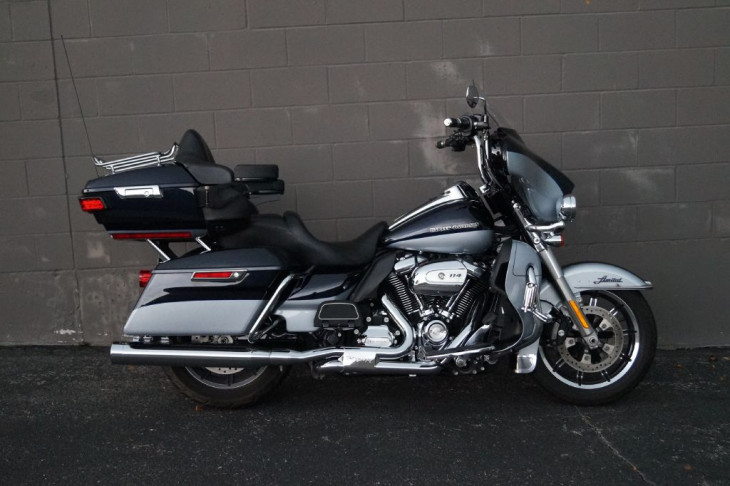 Beautiful Ultra Limited with 2-tone Midnight blue and Barracuda silver paint and equipped with factory security system, luggage rack, adjustable driver backrest, Kuryakyn armrests, highway pegs, 14in large diameter bars with custom Harley heated grips, painted inner fairing, chrome rims, LED rear filler lights, and a powerful 114in Milwaukee 8 engine with a performance air filter and full set of Rinehart true dual exhaust. Priced $5,800 under book value!