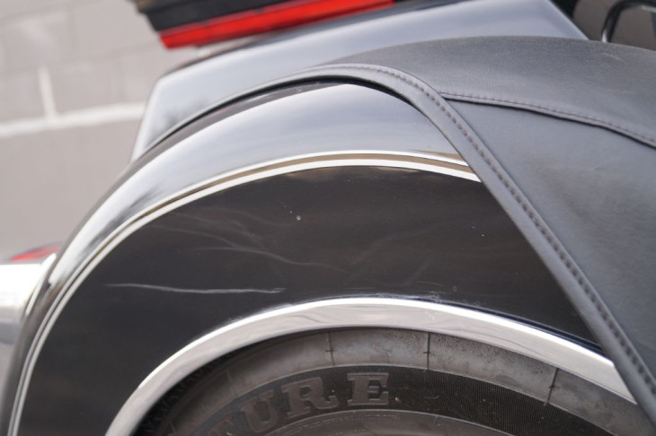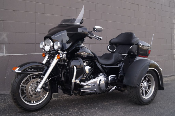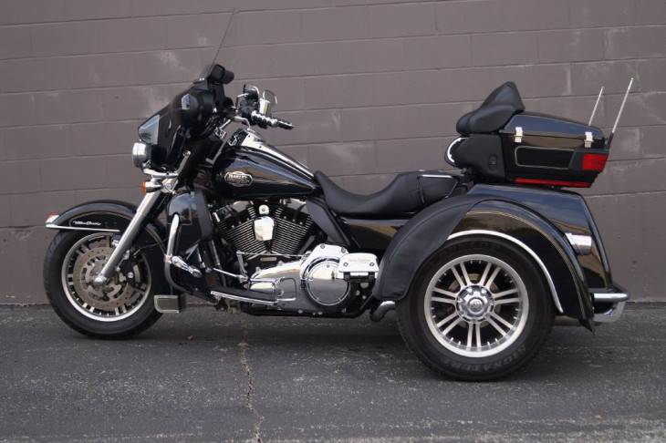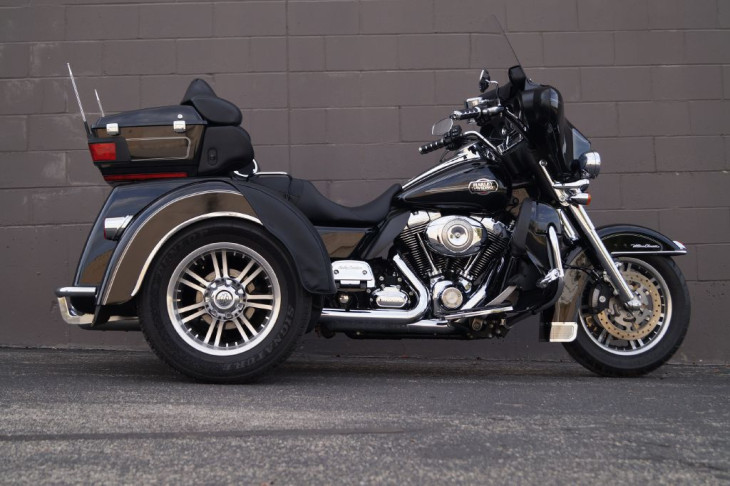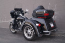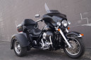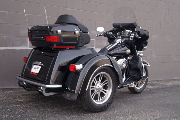 This low mileage trike is outfitted with chrome front forks, a set of highway pegs, kuryakyn iso grips with a throttle boss, HD mud flaps, a chrome rear bumper, upgraded seat, passenger grab handles, leather rear fender bras, windshield pouch organizer, chrome tail light trim, shorty antennas, and the big 3 performance upgrades that include a set of slash cut pipes, stage 1 air filter, and Screamin Eagle fuel tuner.